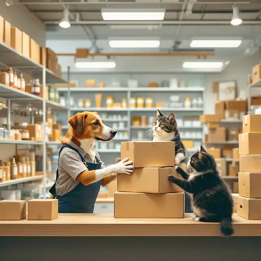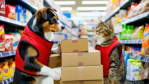 7 months ago A lifelike scene of a dog and a cat working together as employees wearing red vest in a retail store as they handle and pass carton boxes to each other while setting up and organizing the shop. 5c65e6cda32 0 29