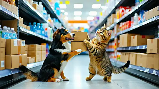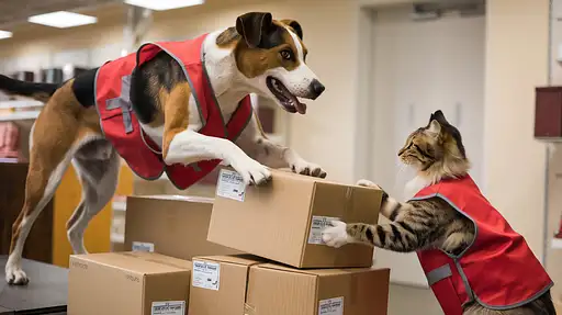 7 months ago A dog and a cat in a retail store, collaborating like employees, passing carton boxes to each other as they organize and set up the shop. make it as realistic as possible. 5c65e6cda32 0 53