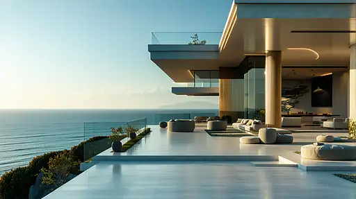 7 months ago Hyper realistic eye level exterior photo of a mid century modern style house overlooking the ocean, daylight, indirect lighting, AD magazine, Frank Lloyd, Eames, Mies van der Rohe 5c65e6cda32 0 23