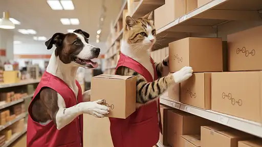 7 months ago A dog and a cat in a retail store, collaborating like employees, passing carton boxes to each other as they organize and set up the shop. 5c65e6cda32 1 34
