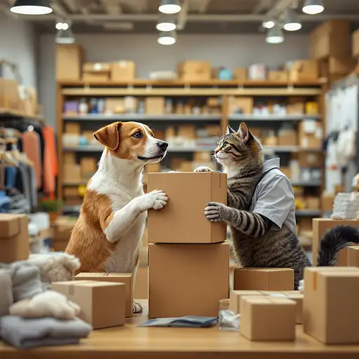 7 months ago A dog and a cat in a retail store, collaborating like employees, passing carton boxes to each other as they organize and set up the shop. make it photo realistic. 5c65e6cda32 0 31