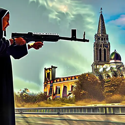 2 years ago nuns with guns, a beautiful nun holding a large machine gun, a cathedral in the background, beautiful outdoor scene, ethereal fantasy, die brücke, surrealist: dreamlike imagery 5d9eba8f1b2 0 130