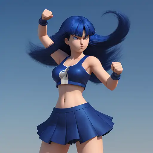 2 years ago girl with ultramarine hair streaming down shoulders, in stance with one fist pumped to the sky, tense look on face, high detail, 3d render, blurry backround style of Rumiko Takahashi 5d9eba8f1b2 0 64
