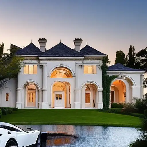 almost 2 years ago a mansion with a double door entry way with stone arches, white McLaren and fountain in driveway, six car garage, garage door opened showing super cars, mansion overlooking body of water, realistic, detailed 637e6600d55 0 97