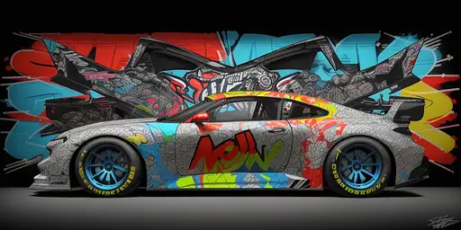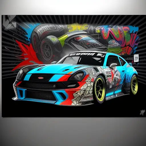 2 years ago Design a captivating wall art piece (only the art that will be on the wall) that fuses the urban energy of graffiti with the dynamic elements of engines, turbos, and NOS bottles. Envision a striking composition dominated by shades of black and blue seamlessly integrating the engine components and racing paraphernalia. Infuse the artwork with a sense of motion and power, capturing the essence of speed and technology through the vibrant interplay of colors and forms. 64584b27b63 0 78