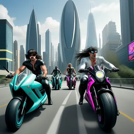 2 years ago Create a hyper realistic photo of modern-day Jetsons-themed backround with Jason Momoa, Keanu Reeves, and Norman Reedus riding futuristic motorcycles together through a bustling, technologically advanced cityscape. Capture their individual personalities while seamlessly blending them into this vibrant, high-tech world." 64584b27b63 0 65