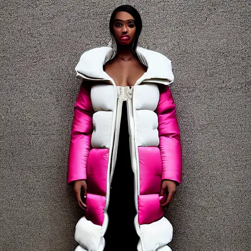 over 2 years ago well lit fashion shoot portrait of extremely beautiful African American female wearing massively over size puffer jacket by craig green, dingyun zhang, yeezy, balenciaga, vetements, sharp focus, clear, detailed, , cinematic, detailed, off white, glamourous, symmetrical, vogue, editorial, fashion, magazine shoot, glossy --ar 2:3 --q 2 --v 5 651583bff12 0 62