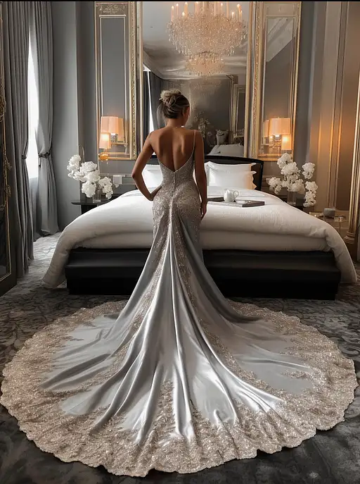 over 2 years ago a woman in a dress standing on a bed, movie still of james bond, long elegant tail behind, silver,ivory, j - lo, official artwork, spikes on the body, inspired by Judy Cassab, soft elegant gown, with a curly perm, photo from the back, in rapture, noir --q 2 --v 5 --ar 3:4 lexxsand89 4 350