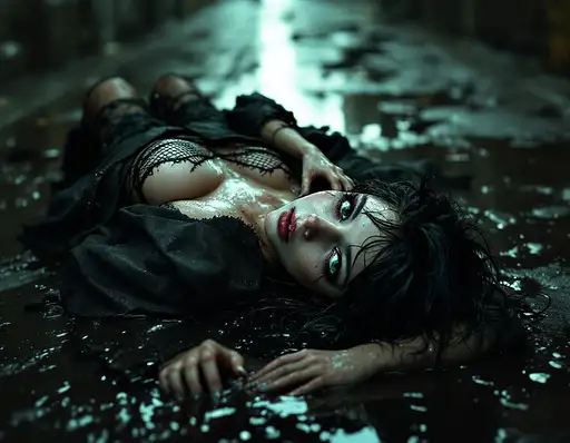 5 months ago white girl, green eyes, black hair, milf, flat chested, small breasts, petite body frame, wearing fishnets, laying down in a puddle of water, she is dirty, wearing a coat with cleavage, messy hair, in a dark alley, 4k, hyperrealistic, ultra detailed 685e514ce7a 0 17