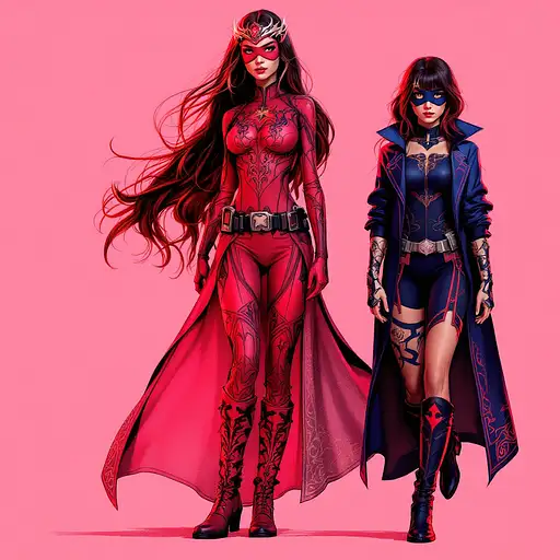 1. **Crimson Siren**: This demoness has long, flowing hair that resembles flickering flames, blending shades of deep red and bright orange. Her eyes are a striking shade of gold, glimmering with mischief and allure. She has smooth, sinuous horns curling elegantly from her temples, adorned with small jewels that catch the light. Her skin is a deep shade of scarlet, with an iridescent sheen that suggests both danger and beauty. She wears a form-fitting, black leather outfit that accentuates her curves, featuring intricate silver detailing that gives a hint of Gothic elegance. Her wings are bat-like and semi-transparent, with a hint of sparkle, allowing her to move gracefully and ominously.
