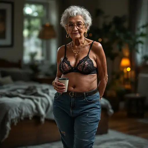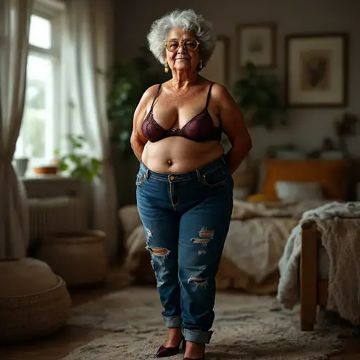 6 months ago Old granny, 70 years old, wrinkled, pretty, wearing gold rings, nose ring, wearing jeans, and a lingerie brah, a cup, hourglass body, wrinkly body, hands behind her back, standing cross legged. high heels, standing in her grandsons bedroom, cozy, warm lighting, 4k, hyperrealistic, short curly gray hair, gold glasses. 685e514ce7a 0 18