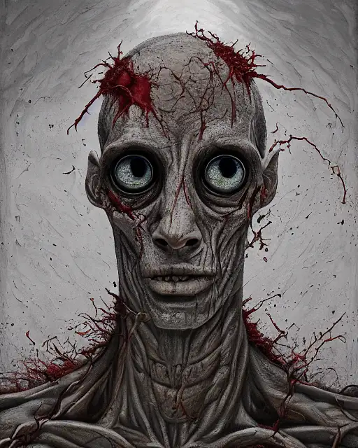 3 years ago Haunting horrifying hyperrealistic detailed painting of a tall slim flesh extraterrestrial creature made of concrete stone brick, covered in, heavy metal, disgusting, creepy, unsettling, and bloodshot eyeballs, hyper detailed, trending on Artstation Stable Diffusion 2 140