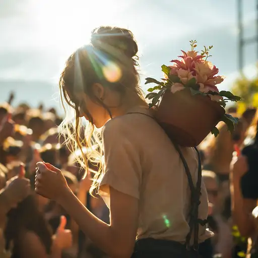 10 months ago A photo model bending over with a large pot flower stuck to her back her back. In the background is a crowd of people with their thumbs up. Rays of light emanate from behind her head. 6fc747eb50e 0 17