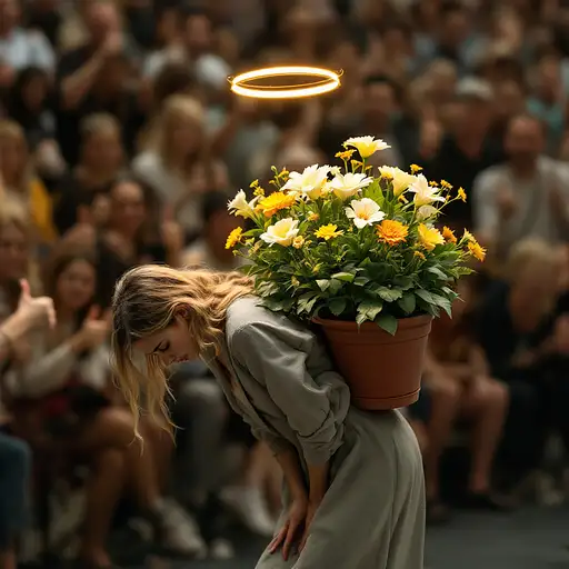 10 months ago A photo model bending over with a large pot flower stuck to her back her back. In the background is a crowd of people with their thumbs up. A halo surrounds her head like a saint. 6fc747eb50e 0 22