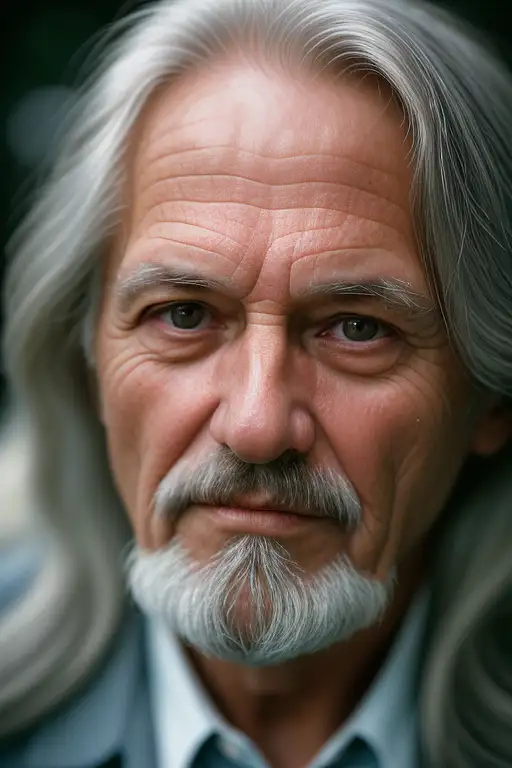almost 2 years ago Portrait photo of a 60 year old man with long silver hair close-up, face, dimly lighting, 35mm film photography, Shot on 85mm lense, F2. 8, Award-winning, High-quality, Photorealistic, Intricate, Elegant 703e1849683 1 59
