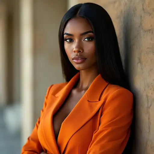 7 months ago close-up of a stunning African American fashion model, ultra-realistic portrait, In a Luxury Office suit, leaning casually against a wall wearing an Orange tailored elegant designer suit, with long Peruvian straight hair. shot on a Sony A7III, high quality --no freckles, blemishes --chaos 50 --ar 1:2--stylize 750 --v 6.1. 72219555758 0 42