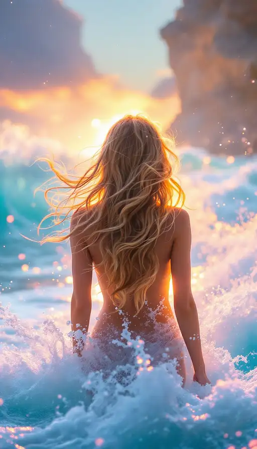 7 months ago Scene: The woman continues walking forward, her wavy hair still flowing. Features: A backdrop of light and beauty, with a heavenly environment surrounding her. The focus is on her wavy hair, artistically resembling the ocean waves. 7261cdd796d 0 26