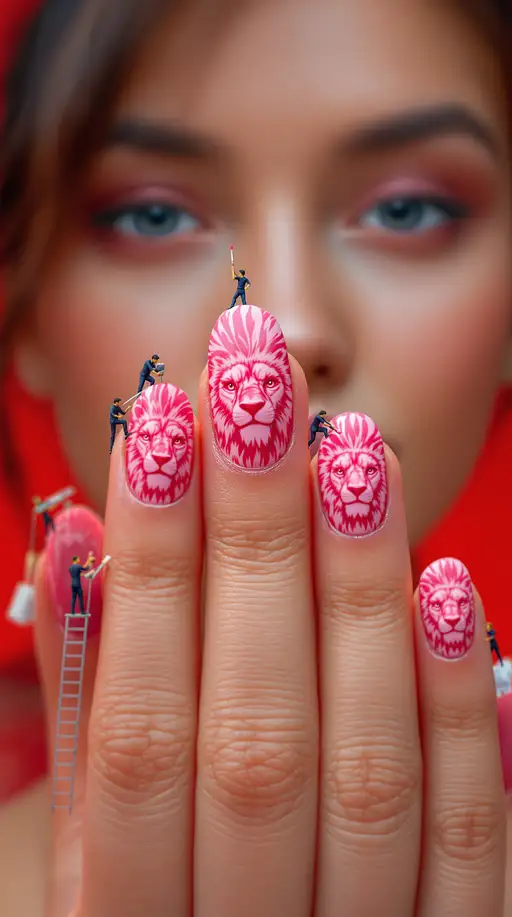 *Cinematic, side-on close-up of the face of a stunningly fair-skinned 25-year-old Iranian woman. Only her face is visible in the image - no other part of her body is shown. She has incredibly beautiful eyes, long eyelashes and full, glossy lips (burgundy red). Her makeup is mesmerizing, with a soft, pale blue-green eyeshadow on her eyelids. Her dark brown hair is slightly wavy, somewhat long and beautifully styled, which is fully visible in the frame and covers half of the woman's face. The camera angle is from the side, showing the depth and texture of her face and hair with a very shallow depth of field and a softly blurred background (bokeh effect). Several miniature, elegant women - who look like beautiful women but are in miniature size - stand around the woman's hair on stools and ladders. They wear elegant white dresses and brush, blow-dry, and add curlers to the woman's hair. The entire scene is presented in a hyper-cinematic style, with the focus on the woman's face and the miniature hairdressers' precise and strange interaction with the woman's hair.*