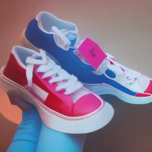 Highest quality, perfect masterpiece, perfect art, 8K, (young and energetic girl, footwear designer, wearing pink-blue-red color-block sneakers, urban hip-hop style dressing, top is clean babes white T-shirt, light blue jeans, socks with white as the main color pink stripes, holding a red and black sneaker, the environment is inside a design studio; The lighting is moody; The overall color tone is vibrant; thick coating style; , delicate face, blond hair girl, (yellow hair: 1. 3), medium and short hair, (black background: 1. 3), pearl illusion, cyberpunk, fashion trends, 3s material, HD, detail performance, c4d, 3D, octane rendering, ray tracing, complex details, animated lighting, OCrenderer, 8k,