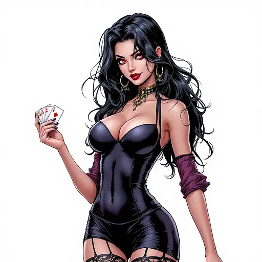 5 months ago Anime woman, mature, milf, full body long shot, with crystal red eyes, pretty face, sexy pose, deviant smile, in the style of piper rudich, comic book style, cartoon, holding playing cards 759bb216847 0 18