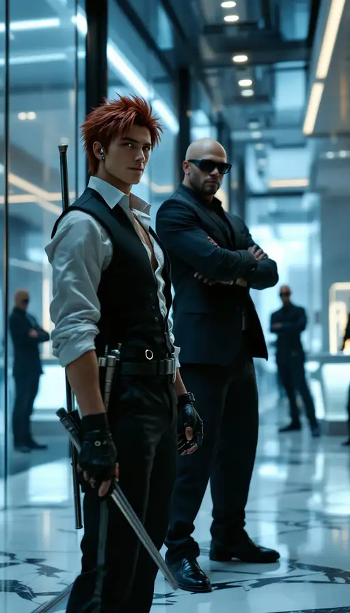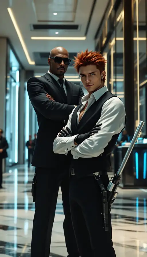 A photorealistic, cinematic, candid shot of two men inspired from Reno and Rude from Final Fantasy VII working as elite private security officers in a sleek, high-rise corporate lobby. Reno, who is a Japanese ethnicity, laid back young man with his spiky red hair, smirk cockily with a laid back attitude, wears a fitted black suit over a white shirt that is tucked out, the white shirt is unbuttoned at the top, fingerless gloves, and an earpiece. He has a sleek, narrow, extendable silver baton holstered at the side of his belt. Rude, who is a bald, dark skin Latino man towering beside him in a sharp black suit, sunglasses, and a concealed earpiece, stands with arms crossed and black leather gloves, exuding silent intimidation. The marble-floored lobby has glass walls, neon-lit reception desks, and office workers in the background. The lighting is cool and futuristic, with reflections on polished surfaces, giving the scene a high-tech, high-stakes vibe. Photorealistic, ultra-detailed, cinematic lighting, candid shot, 8K resolution, realistic textures. The models features and scene should be based off a real person and a real place. The model should not be looking at the camera.
