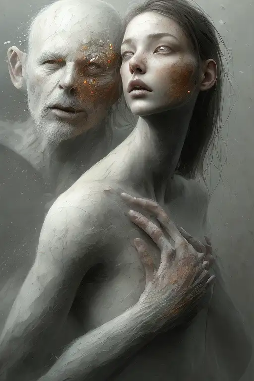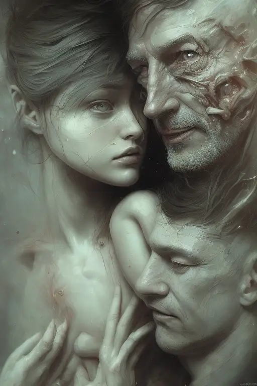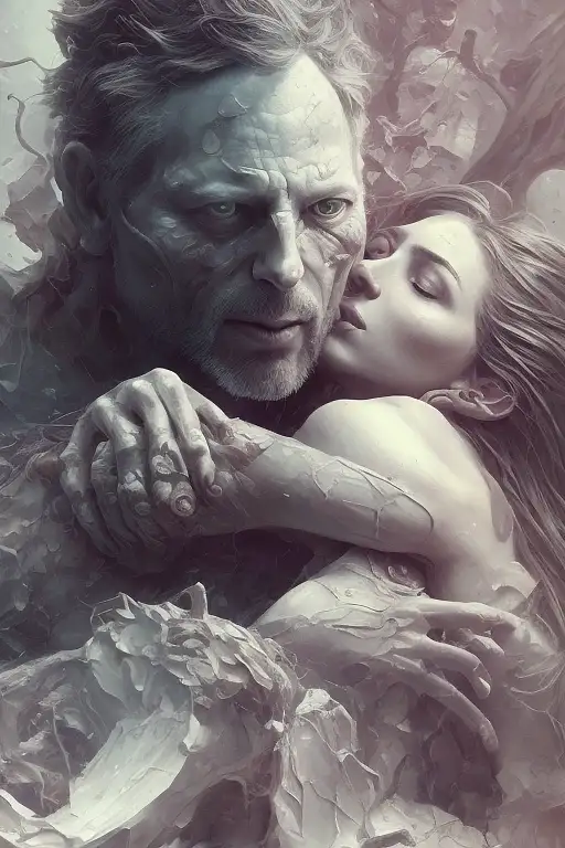 olpntng style, YOUNG COUPLE KISSING, Kent Williams style Dave McKean style, octane render, unreal engine, hyperrealism, perfect composition, beautiful detailed intricate insanely detailed octane render trending on artstation, 8 k artistic photography, photorealistic concept art, soft natural volumetric cinematic perfect light, Color Palette – The 60-30-10 Rule,, award - winning photograph, masterpiece, sharp focus, intricate detail, highly detailed, sharp focus, intricate details, highly detailed by John J. Muth, WLO, George Pratt and alphonse mucha, fantasy, intricate artwork masterpiece, ominous, matte painting movie poster, golden ratio, trending on cgsociety, intricate, epic, trending on artstation, by artgerm, h. r. giger and beksinski, highly detailed, vibrant, production cinematic character render, ultra high quality model, professional ominous concept art, by artgerm and greg rutkowski, an intricate, elegant, highly detailed digital painting, concept art, smooth, sharp focus, illustration, in the style of Dave McKean, scott hampton, and Bill Sienkiewicz., reflective eyes, Pixar render, unreal engine cinematic smooth, intricate detail, oil painting, heavy strokes, paint dripping, oil painting, heavy strokes, paint dripping