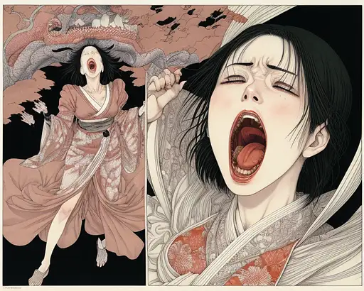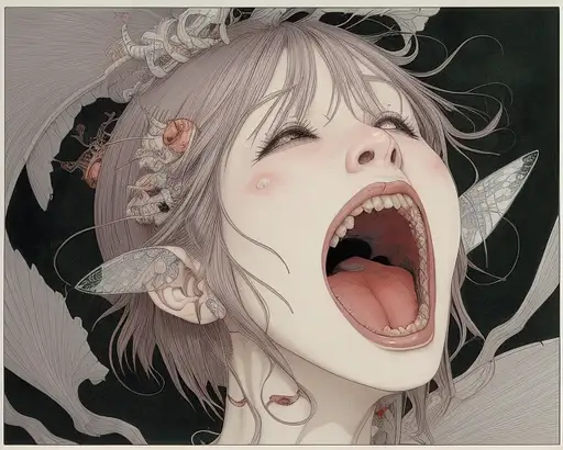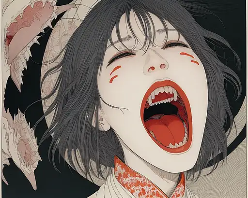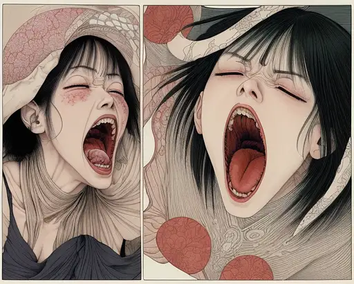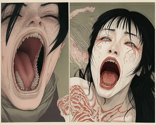 over 1 year ago a woman screaming, artwork by Takato Yamamoto and Chika Yamada, very detailed, futuristic, a monsters is coming out of her mouth 7b8defd0a20 1 63