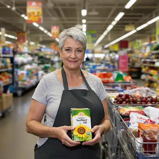 8 months ago In the photo, a woman of about fifty, gray-haired with a short haircut, the head of a department in a grocery store, looks at the camera and stands in the sales area, holding a box of sunflower oil in her hands against the backdrop of a string of carts loaded with goods. 86285a15997 1 42