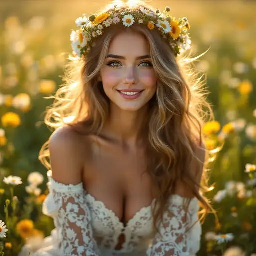 A breathtaking scene of a young couple sitting together in a sunlit meadow filled with blooming wildflowers. The woman has long, wavy brown hair and wears a delicate blue lace with off-shoulder sleeves, her head adorned with a floral crown of daisies and wildflowers. She smiles warmly as she gently places a similar flower crown on the man's head. The man has long, golden-yellow hair, a clean-shaven face, and a strong, attractive appearance. He is dressed in a loose, off-white linen shirt, exuding a natural and romantic aesthetic. Both are bathed in the golden-hour sunlight, their faces glowing with warmth and happiness. The background is a softly blurred field of flowers, with warm golden hues enhancing the dreamy atmosphere. The image has raw, hyper-realistic details, capturing every strand of hair, fabric texture, and floral element. Sharp and crisp composition, with a cinematic depth of field, ensuring every detail is vivid and lifelike."