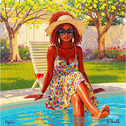 2 months ago STRING ART STYLE, 400 pixels, full body image fits within the margins, whimsical, hyper realistic, a beautiful African American red haired woman with loc updo wearing wide rimmed sunglasses and red lipstick is wearing a Adire sundress and a floral sunhat. She has a glass of wine in her hand and is sitting on the deck with her feet in a small pool in her backyard surrounded by colorful flowers, green grass and a couple of oak trees. The sun is shining. oil painting, STRING ART STYLE, white background. 8ab53dd69c2 PRO 0 7