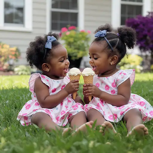 3 months ago centered an of toddler African American girl twins sitting in the grass in front of their house sharing a melting ice cream cone 8ab53dd69c2 PRO 0 6