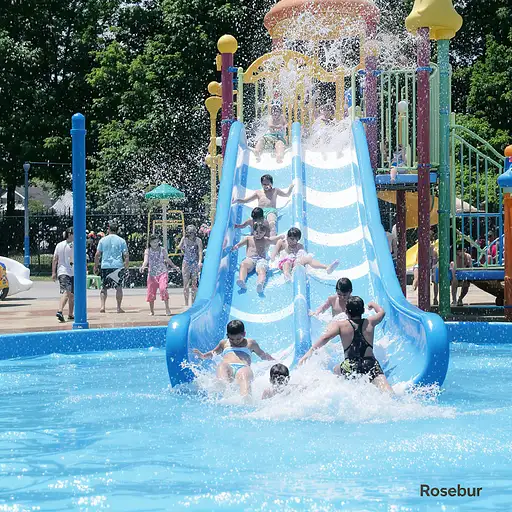 3 months ago 4k HD highly detailed realistic image of a water park with a slide in a neighborhood park. Ethnic kids are playing together, sliding down the slide, and playing in the water splashes on a bright, hot, sunny day. With small font text 'Rosebur' in the lower right corner. 8ab53dd69c2 PRO 0 12