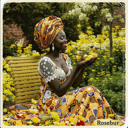 3 months ago An African woman in a beautiful kente lace dress, sitting in a garden filled with yellow and white flowers and feeding the birds. Vintage style With small font text 'Rosebur' in lower right corner. 8ab53dd69c2 PRO 0 13