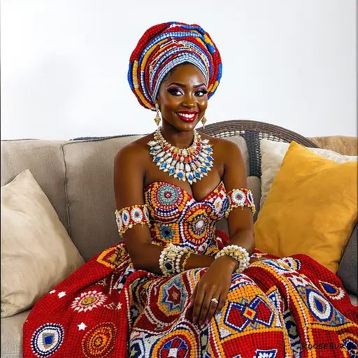3 months ago Acrylic highly detailed acrylic image of an AFRICAN AMERICAN lady IS DRESSED IN AN ORNATE, COLORFUL DRESS MADE OF MAASI BEAD ART, ALONG WITH ALL THE ACCESSORIES, sitting on a sofa. BACKGROUND IS AN AFRICAN-STYLE LIVING ROOM. WHITE BACKGROUND with small font text "ROSEBUR' at the bottom right. 8ab53dd69c2 PRO 0 19