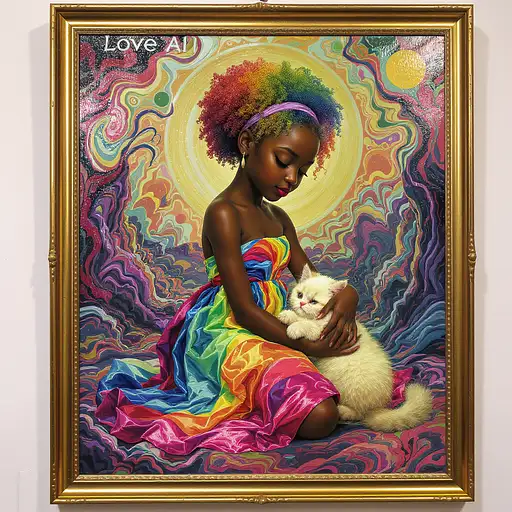 3 months ago dmt art, 4K, HD, whimsical, a beautiful African American little girl has short curly rainbow hair and is wearing a flowing rainbow dress. She is on her knees and is playing with her fluffy white kitten. Around her is a colorful psychedelic world. glossy oil painting. With the text 'Love All'. Framed in a thin gold frame on all four sides. 8ab53dd69c2 PRO 1 13