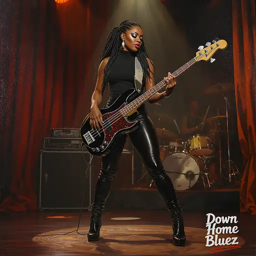 3 months ago FULL BODY VIEW: 4K glossy oil painting of an African American woman with flawless makeup, standing on stage with her band in the background. She is playing a bass guitar, in full head-to-toe- body view, wearing a black turtleneck, black leather pants, long black twists, and detailed high heel boots. With the text 'Down Home Bluez' in the lower right corner. 8ab53dd69c2 PRO 0 12