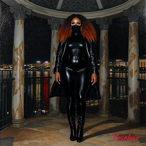 3 months ago FULL BODY VIEW: 4K glossy oil painting of a regal large full-figure African American woman, standing under a gazebo, in full head-to-toe- body view, wearing a black turtleneck with a black mask covering the mouth and nose, black leather jumpsuit and matching leather jacket, with ombre wavy hair, detailed high heel boots, with a cityscape night background.. With 1px cursive font text 'Rosebur' in lower right corner. 8ab53dd69c2 PRO 0 8