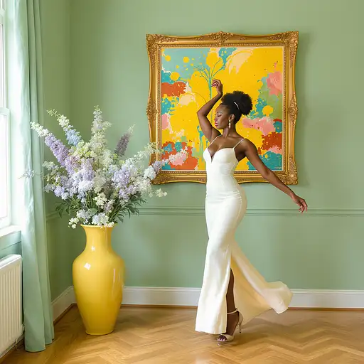 3 months ago framed in ornate gold on all 4 sides, A splash of bright colors in a room painted with pale green with a large vase in pale yellow sitting in the corner with light lavander flowers and light blue flowers and a beautifully dressed African American lady in similar pale colors dancing around in high heels 8ab53dd69c2 PRO 0 16