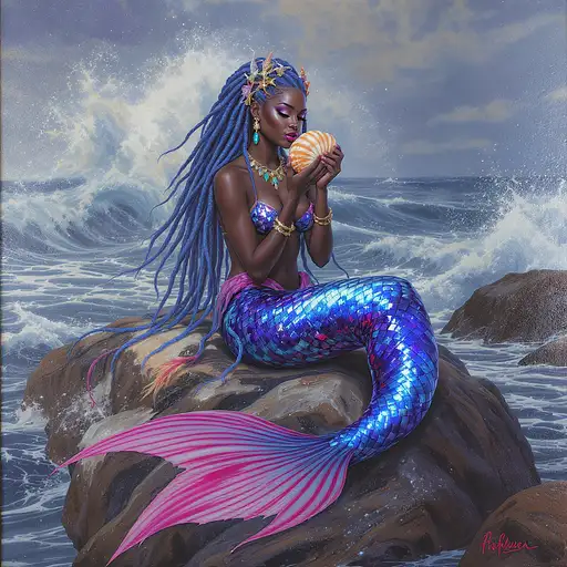 3 months ago airbrushed oil painting A melanated mermaid with long, flowing blue locs adorned with aquatic-themed accessories sits on a rock by the ocean. She holds a large seashell close to her face. Her shimmering tail features vibrant scales in shades of purple and red, and the turbulent ocean waves crash in the background under a dramatic sky. The scene conveys a sense of serenity. 8ab53dd69c2 PRO 0 20
