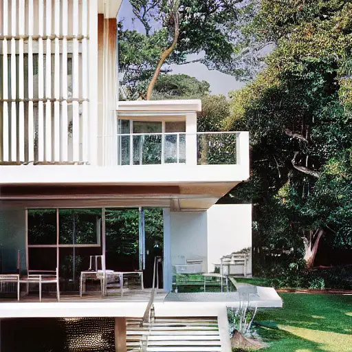 over 2 years ago hyper realistic eye level exterior photo of a mid century modern style house overlooking the ocean, daylight, indirect lighting, AD magazine, Frank Lloyd, Eames, Mies van der Rohe 8bb7954035f 0 80