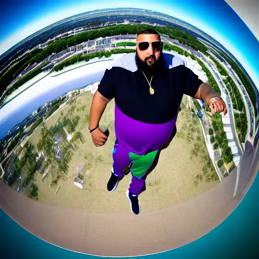 over 2 years ago DJ Khaled soaring through the air at high velocities through a fisheye lens, smooth render, 32K, ultra realistic, amazing quality, 3D 8de893327f0 0 36
