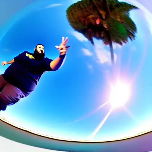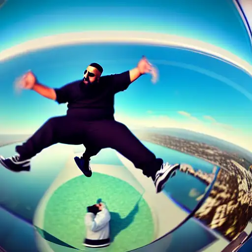 over 2 years ago DJ Khaled soaring through the air at high velocities through a fisheye lens, smooth render, 32K, ultra realistic, amazing quality, 3D 8de893327f0 0 43