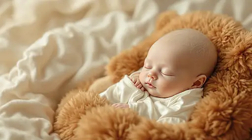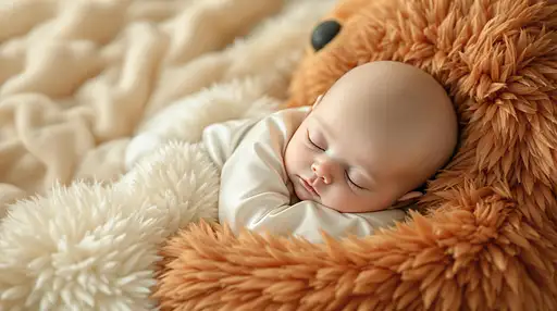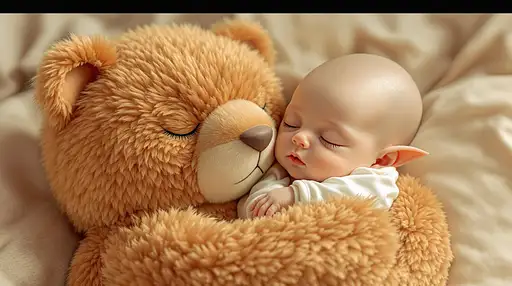 7 months ago in the arms of an angel, a beautiful and (cute alien baby ) with topaz color hairs duvet ,pointed ears, wearing a silk white adorable pyjamas, asleep in the arms of a plush animal, the plush animal is much larger than the baby ,the thick fur of the animal is in a red earth tones colors, set against a soft, cream and white tone background that adds warmth and coziness to the scene, the atmosphere is very charming, and full of love and happiness, uhd beautiful details and textures, perfect image characters photorealistic quality 91e1b4b2a90 PRO 1 38
