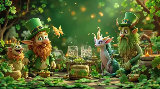 7 months ago St. Patrick's Day celebration featuring mythical fantasy creatures of Ireland, such as leprechauns, merrows, and púca, amidst festive shamrocks and Celtic patterns. 3d photo realism uhd 91e1b4b2a90 PRO 1 31