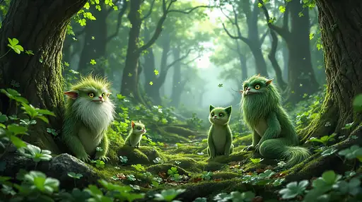 7 months ago scenery, in the forest on St. Patrick's Day celebrations featuring mythical fantasy creatures of Ireland, such as leprechauns, merrows, and púca, amidst festive shamrocks and Celtic patterns.uhd photo realistic characters best quality details and textures 91e1b4b2a90 PRO 0 31