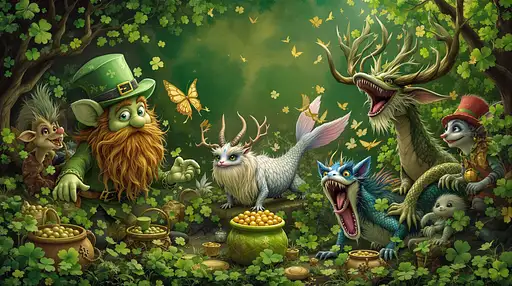 7 months ago scenery, in the forest on St. Patrick's Day celebrations featuring mythical fantasy creatures of Ireland, such as leprechauns, merrows, and púca, amidst festive shamrocks and Celtic patterns.uhd photo realistic characters best quality details and textures 91e1b4b2a90 PRO 1 40