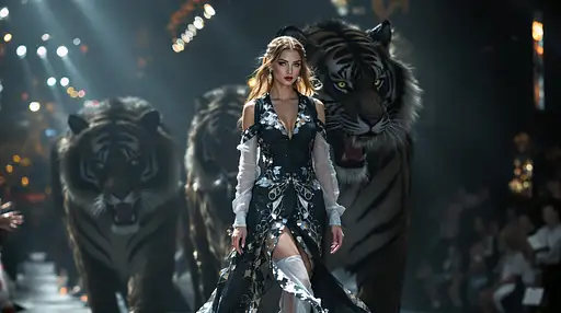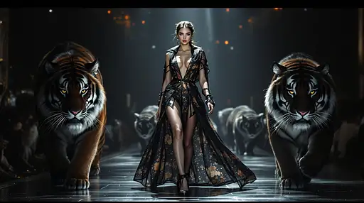 8 months ago catwalk,fashion show, beautiful model ,walking with huge felines,fictive black tigers on the sides,their clothings are in complementing the scene adding glamour and elegance, 8k very fine details and textures,spots lighting 91e1b4b2a90 PRO 1 38