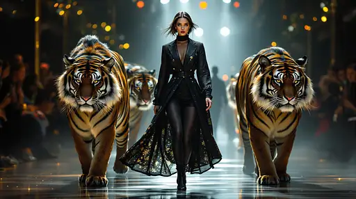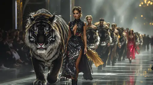 8 months ago catwalk,fashion show, beautiful model ,walking with huge felines,fictive black tigers on the sides,their clothings are in complementing the scene adding glamour and elegance, 8k very fine details and textures,spots lighting 91e1b4b2a90 PRO 1 32