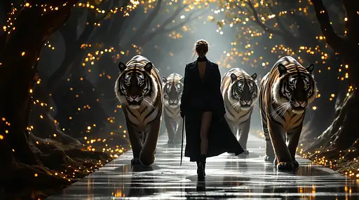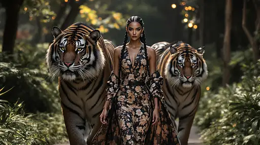8 months ago catwalk,fashion beautiful model ,walking with huge felines black tigers on the sides,their clothings are in complementing the scene adding glamour and elegance, 8k very fine details and textures,spots lighting 91e1b4b2a90 PRO 0 34