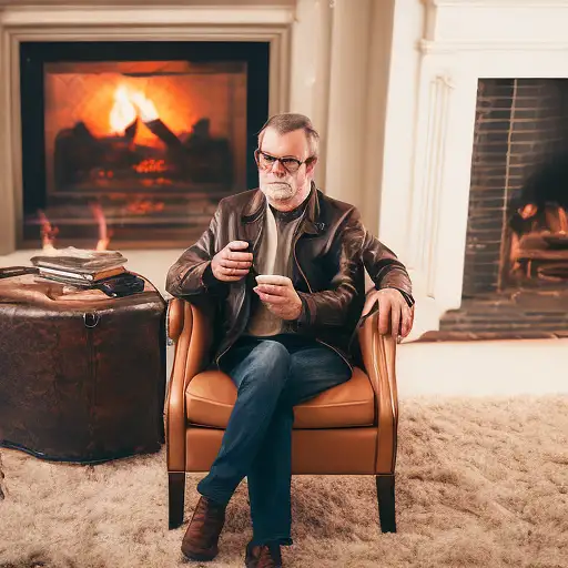 kind wise father, wearing a leather jacket, sitting in a chair by the fireplace, in front of the fireplace are boxes of gifts, he is pensive and dreamy, thinking about the future, in his hand a cup of hot cocoa, modern interior style, which has an old dj console, he looks a bit like enstein. Leica 50mm, best quality, high resolution, beautiful lighting, Hasselblad